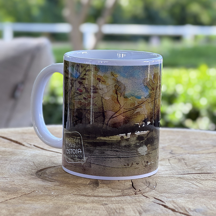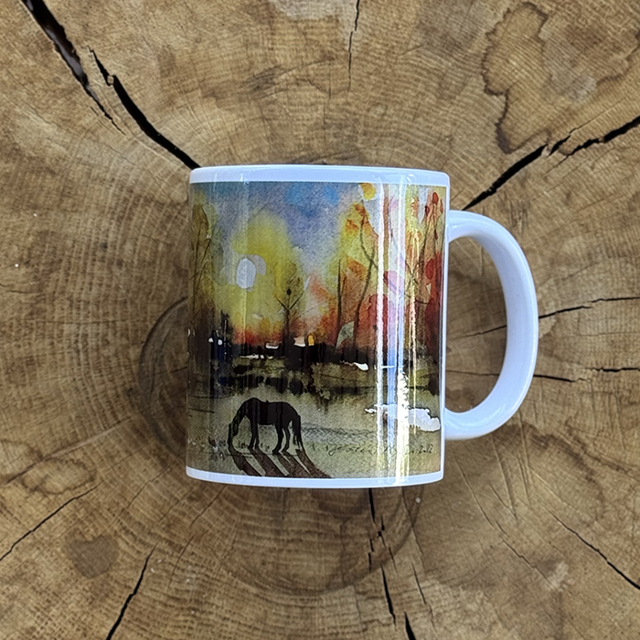 Ceramiczny kubek o pojemności 330ml z nadrukowanymi pięknymi pracami Gosi Mąkosy przedstawiającymi konie.