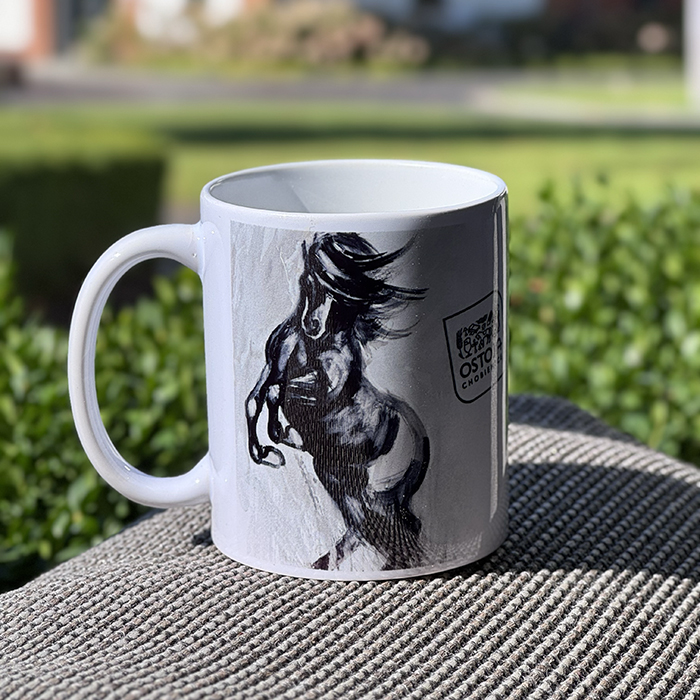 Ceramiczny kubek o pojemności 330ml z nadrukowanymi pięknymi pracami Gosi Mąkosy przedstawiającymi konie.