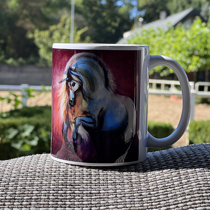 Ceramiczny kubek o pojemności 330ml z nadrukowanymi pięknymi pracami Gosi Mąkosy przedstawiającymi konie. Oryginalna pamiątka lub prezent.