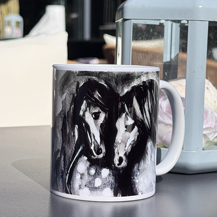 Ceramiczny kubek o pojemności 330ml z nadrukowanymi pięknymi pracami Gosi Mąkosy przedstawiającymi konie.